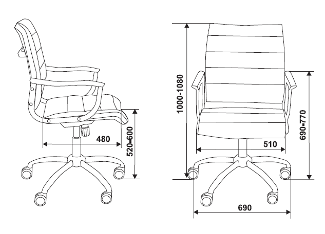 Хромированный металлический каркас, крестовина и подлокотники (с пластиковыми накладками)